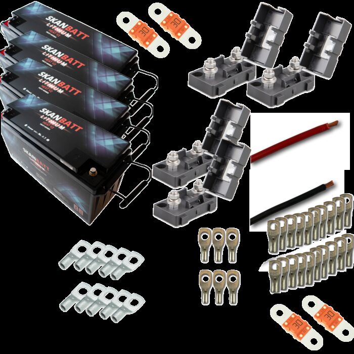 Pakke med 4 Skanbatt lithium Heat 51,2V 50Ah med 8 års garanti, kabling og sikringer