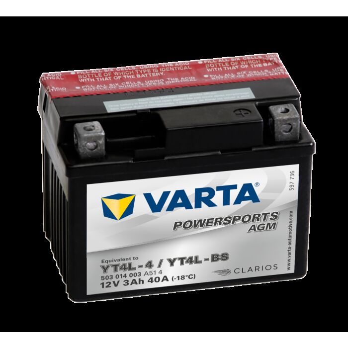 VARTA AGM MC Batteri 12V 3AH 40CCA (114x71x86mm) Polstilling 5 - Plusspol til høyre YTX4L-BS
